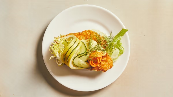 Pankopaneret rødspætte med hjemmerørt remoulade, citron, frisk grønt og urter.
